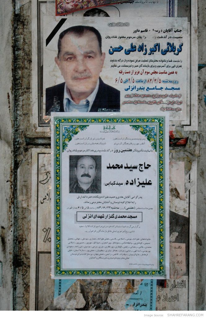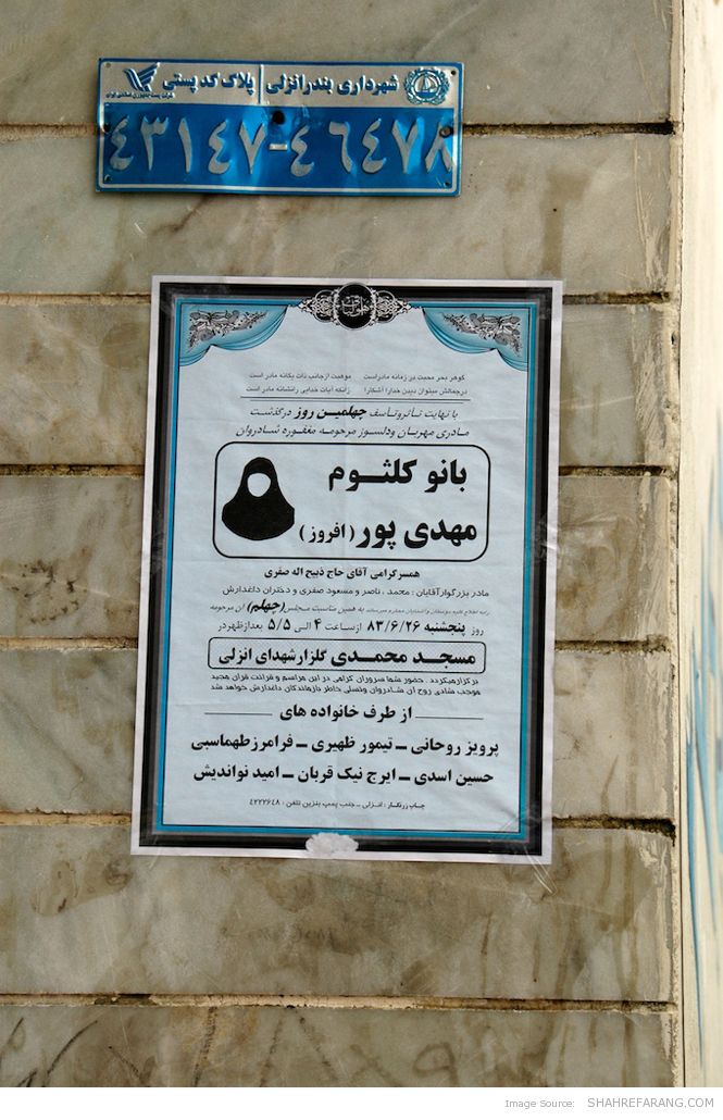 امروزه تصاویر درگذشتگان نه تنها در روزنامه ها بلکه بر دیوارها و سنگ قبرهای کنده کاری شده با لیزر نیز به چشم می خورد. تصاویر زنان با پیکتوگرامی از چهره ی زن محجبه عوض می شود. در مواردی این تصاویر از نمادهایی تصویری برای القای اعتقادات متوفی نیز بهره می برند.