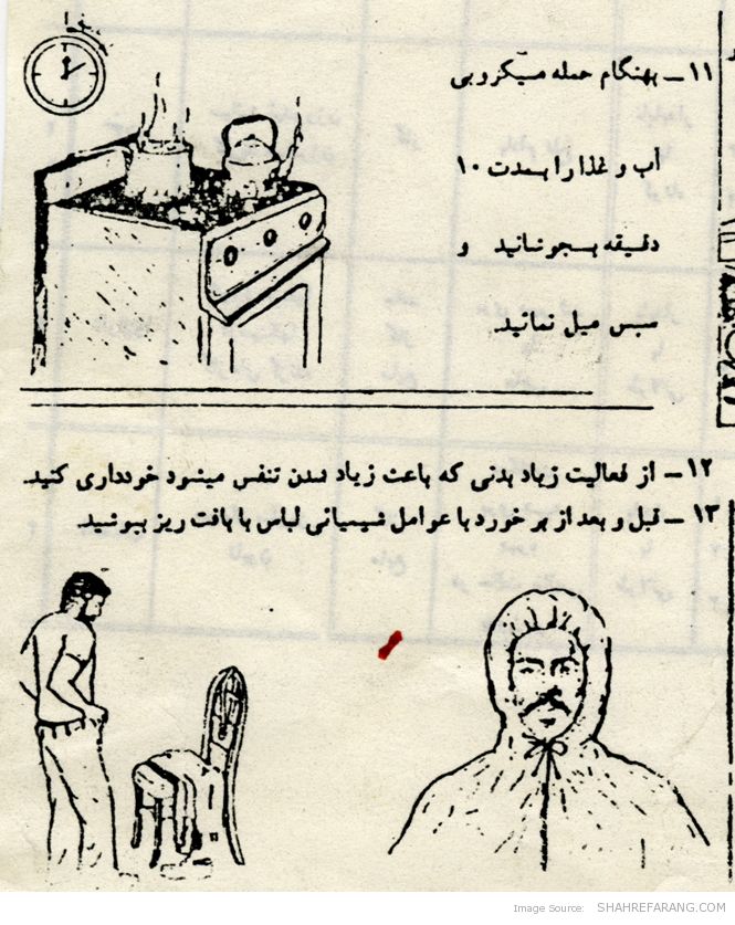 این راهنمای فتوکپی شده به همراه دو عدد دستکش نایلونی (از نوعی که در شیرینی‌فروشی ها و قصابی ها استفاده می شود) به همراه یک کیسه نایلون بزرگ‌تر — که در قسمت جلوی آن تکه‌ ای ذغال منقل پیچیده در میان ابر دوخته شده بود — میان سربازان ستاد مشترک ارتش توزیع شد. به سربازان گفته شد که در صورت بروز حمله‌ی هوایی ابر را در آب فرو برده، کیسه را به سر کشیده، دستکش را به دست کرده، و به سمت ارتفاع حرکت کنند. از کیت نام برده تنها این راهنما به جا مانده است. بنا بر آنچه در برگه ی راهنما آمده «حفاظت در برابر حملات شیمیایی و میکربی ساده و ممکن می باشد.» برگه ی راهنما توصیه می کند «به هنگام حمله ی میکروبی آب و غذا را به مدت ده دقیقه بجوشانید و سپس میل کنید.»